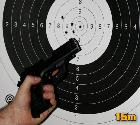 Összességében a Combat a teszt során (kb. 100 lövés) remekül működött, kiválóan uralható volt még 1 kézzel is. A sütése kissé hadipisztolyos, ennek ellenére emberarcnyi a szórása DA-ban 15 méterről.